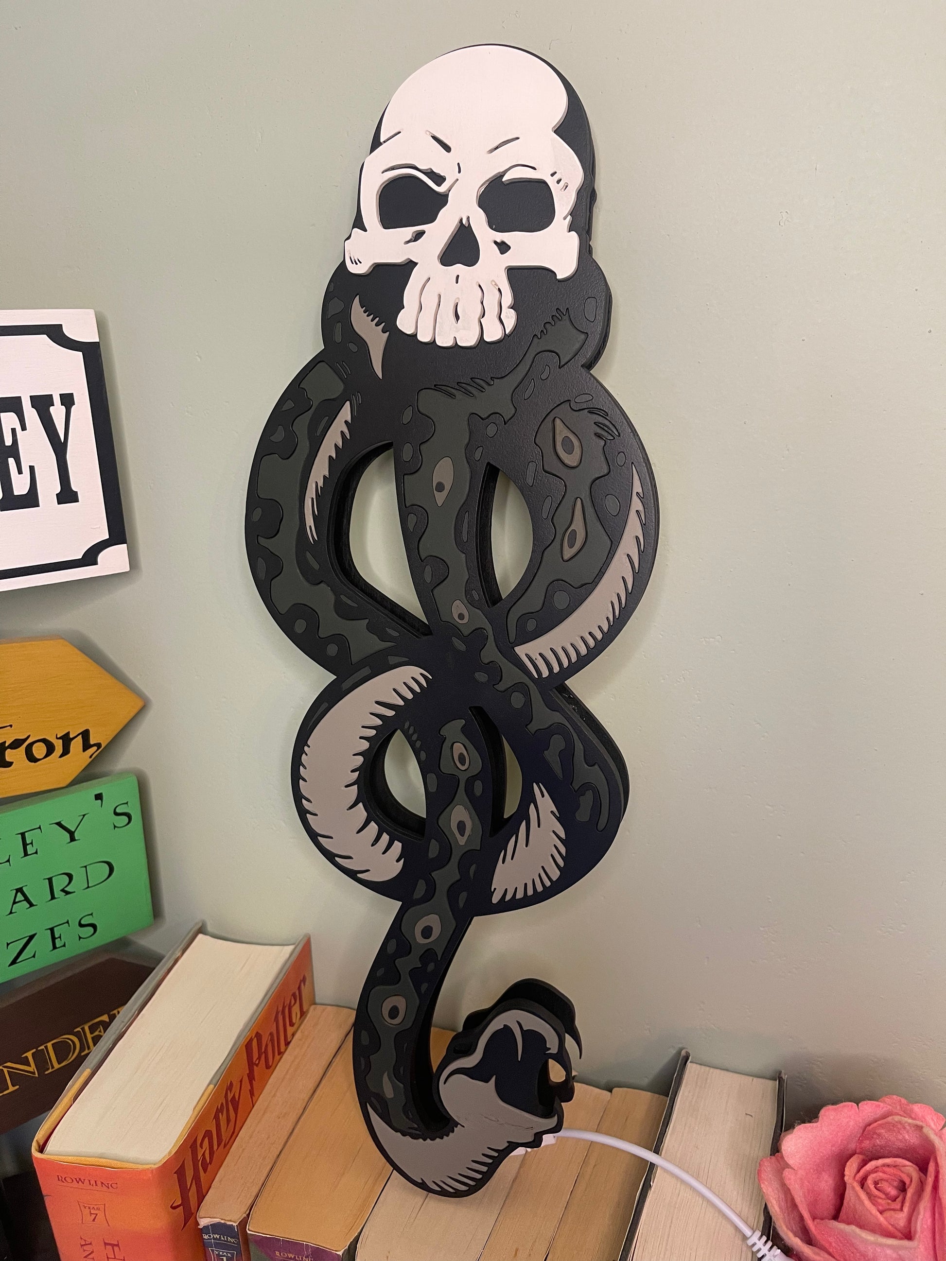 Wooden Dark Mark sign with green LED lights that emit the perfect green glow. Perfect night light for the dungeons!