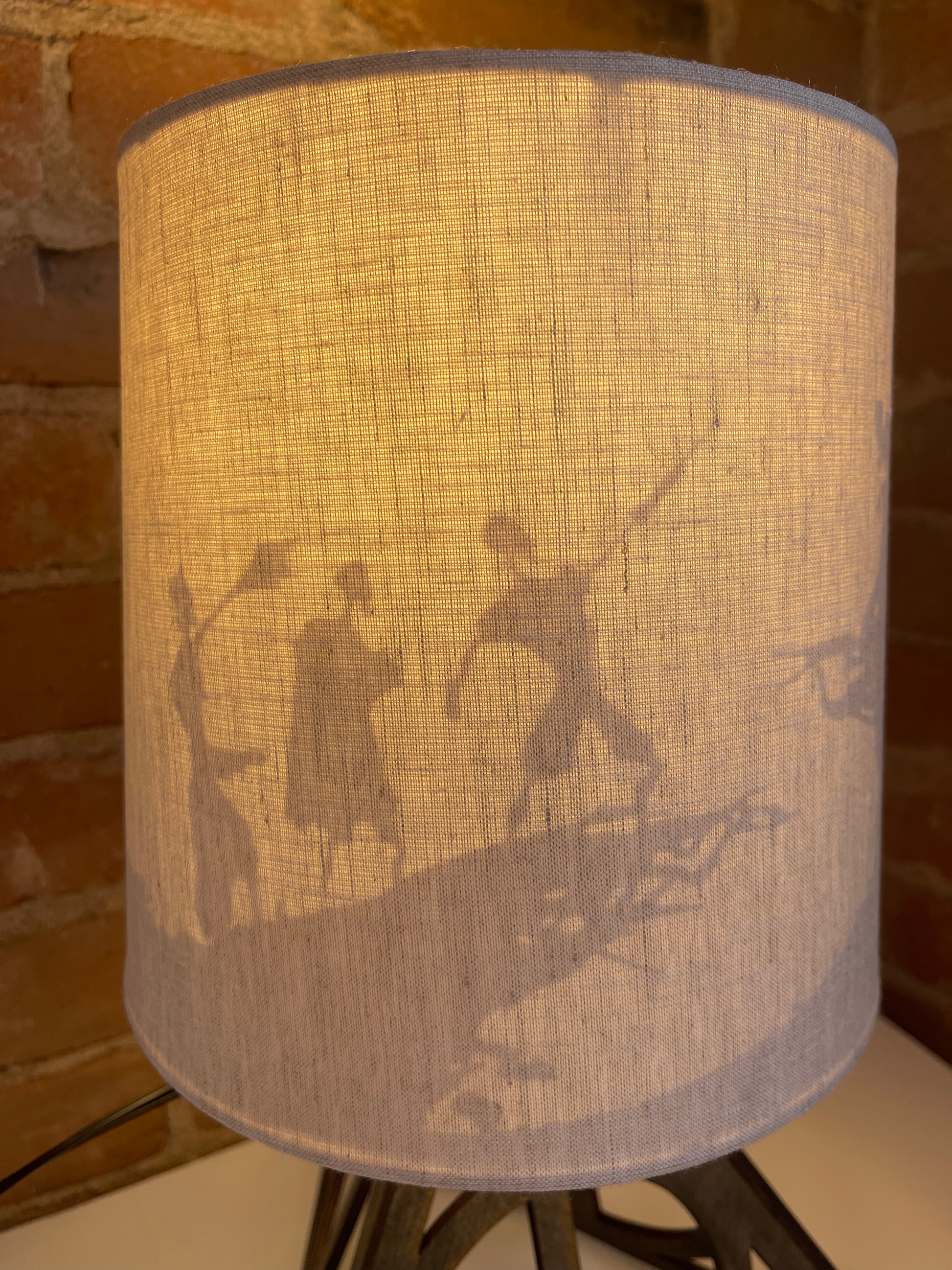 'The Three Brothers' lamp with beautiful handmade wooden base. We use a dark stained lightweight 1/4" oak plywood that we laser cut, and then hand assemble each lamp. The lampshade is a beige/off-white color that features a silhouette of the Three Brothers as depicted in the Deathly Hallows animation.