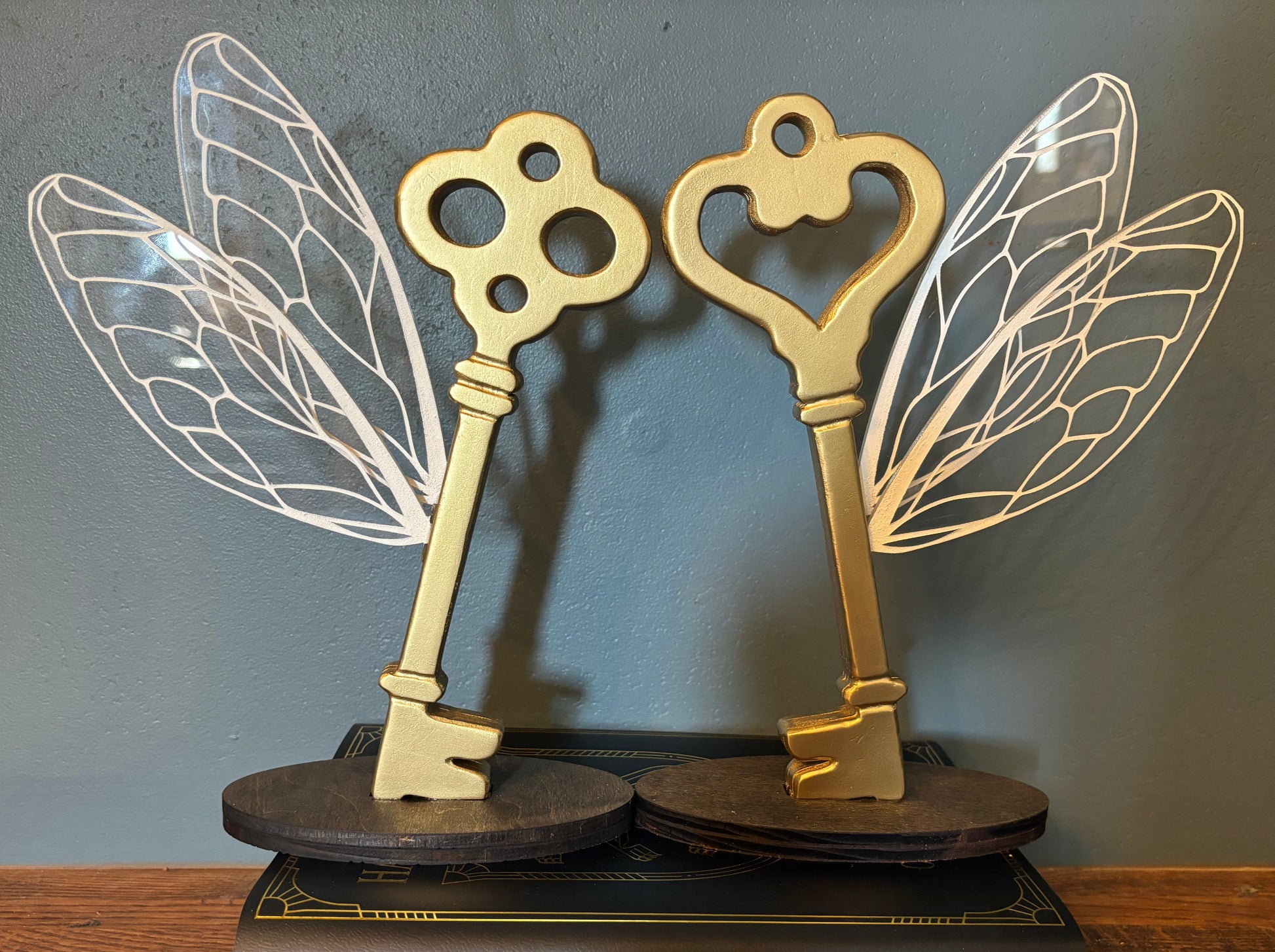 These Flying Keys are a wooden key and base with acrylic wings. The keys are approximately 9.5 inches tall at the highest point and 8 inches at the widest point.