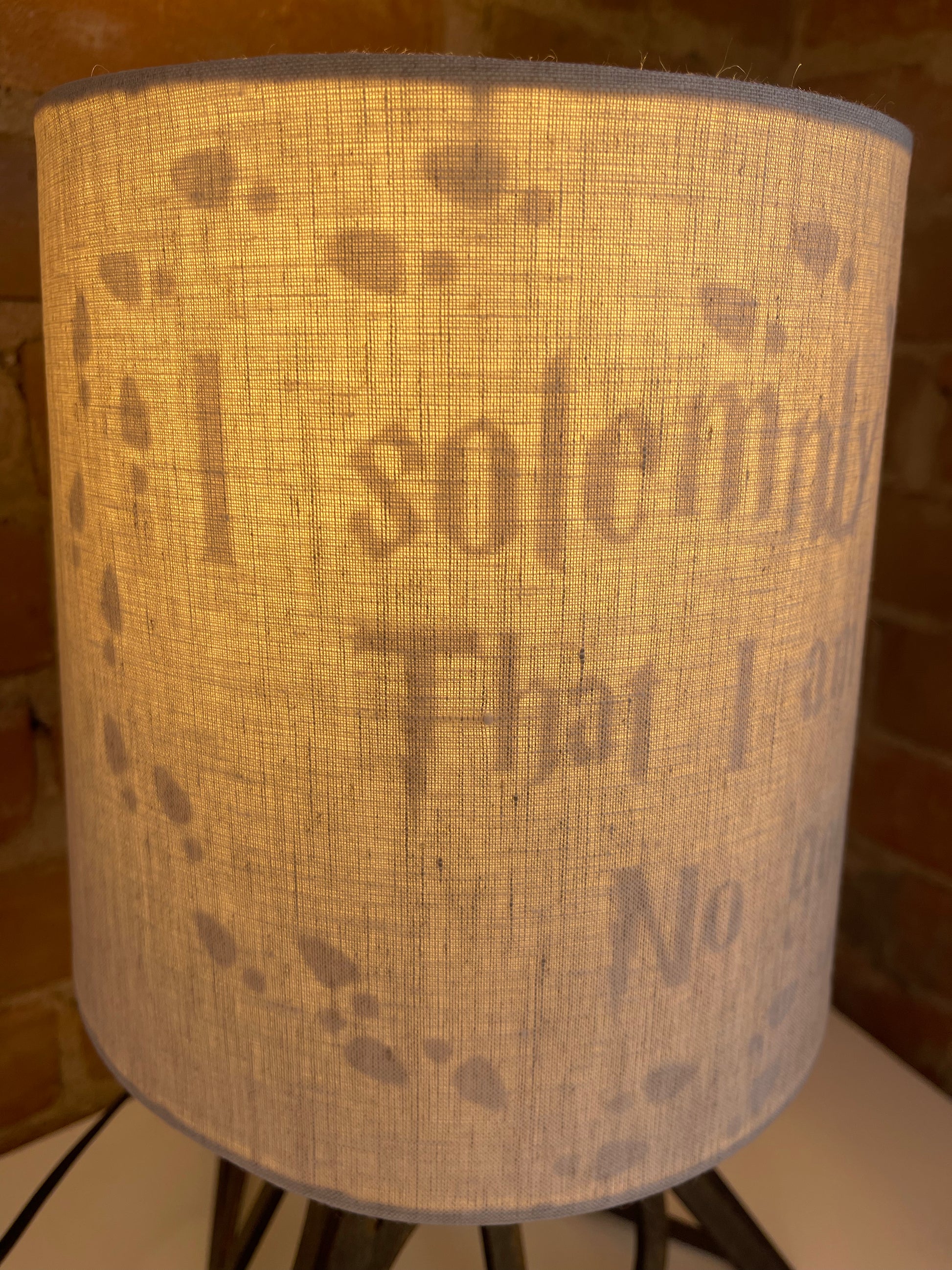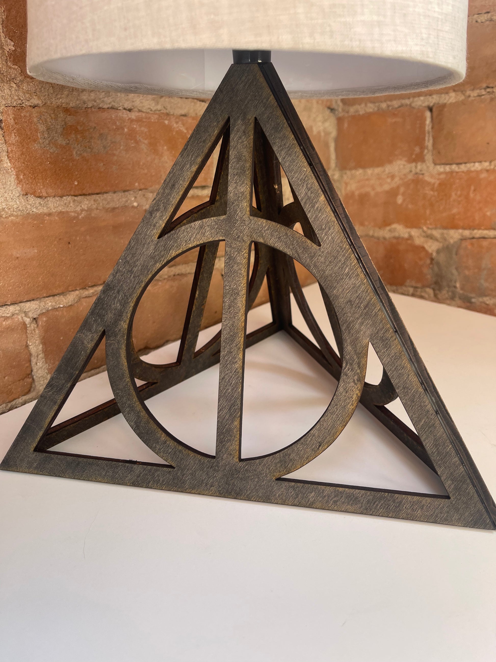 "I Solemnly Swear That I am Up to No Good" lamp with beautiful handmade wooden base. We use a dark stained lightweight 1/4" oak plywood that we laser cut, and then hand assemble each lamp. The lampshade is a beige/off-white color that features a silhouette of footprints from the map and the famous phrase which can be seen once the lamp is turned on. Note the footprints are applied at random and will not necessarily be in the exact same position as in the listing pictures.