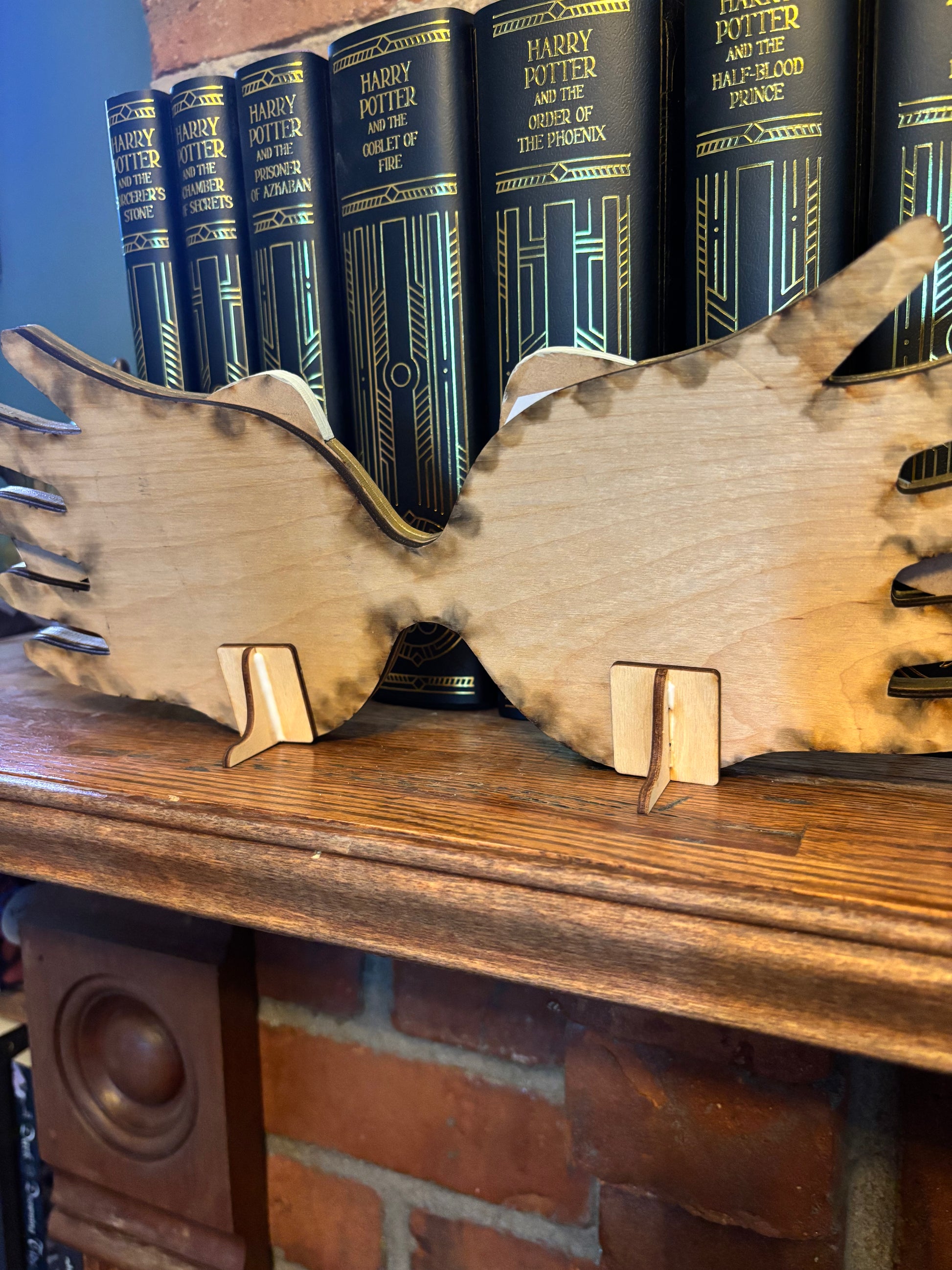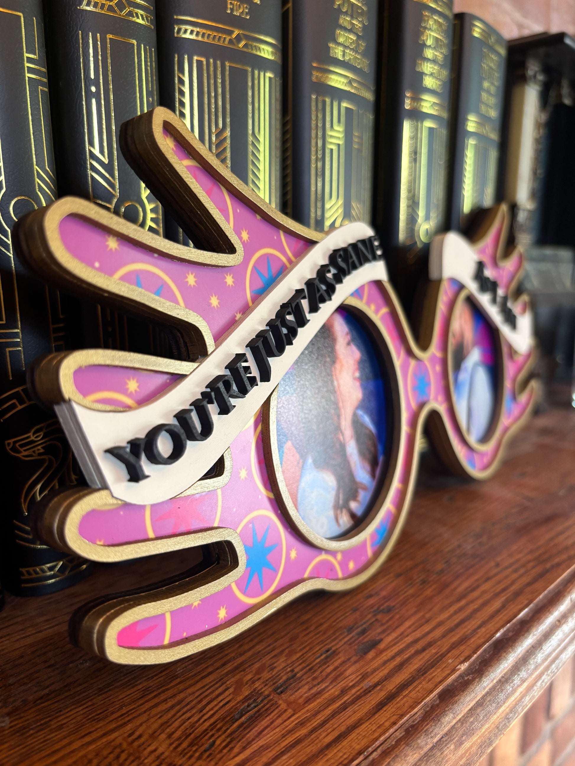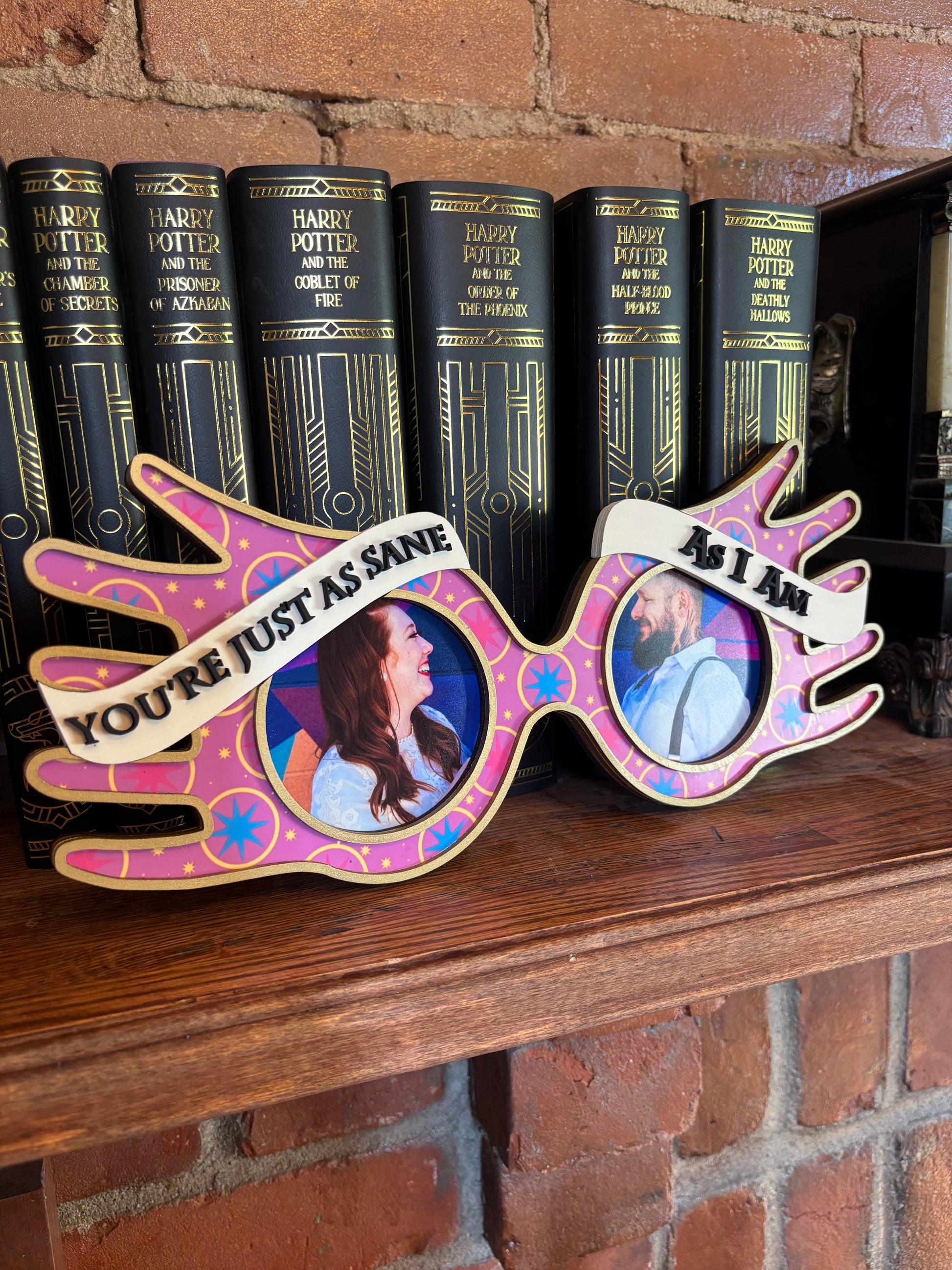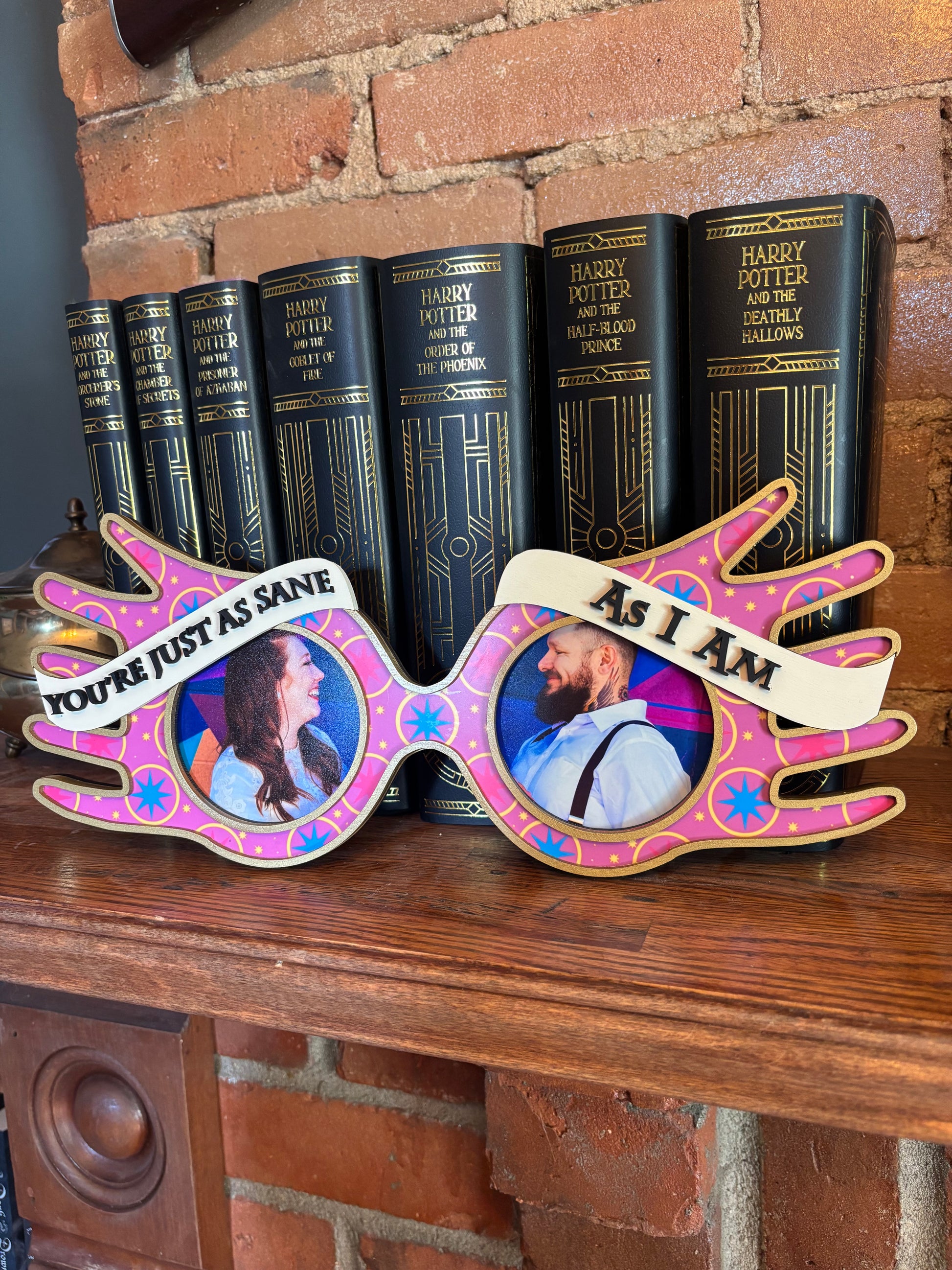 Wooden Picture frame that holds two photos. This piece measures 13.5 inches wide by 5.5 inches tall. Each cutout fits a 4.15 inch x 3.5 inch photo. You will have to cut a picture to fit, but each frame comes with cardboard pieces you can use to measure the correct size photo for the slot.