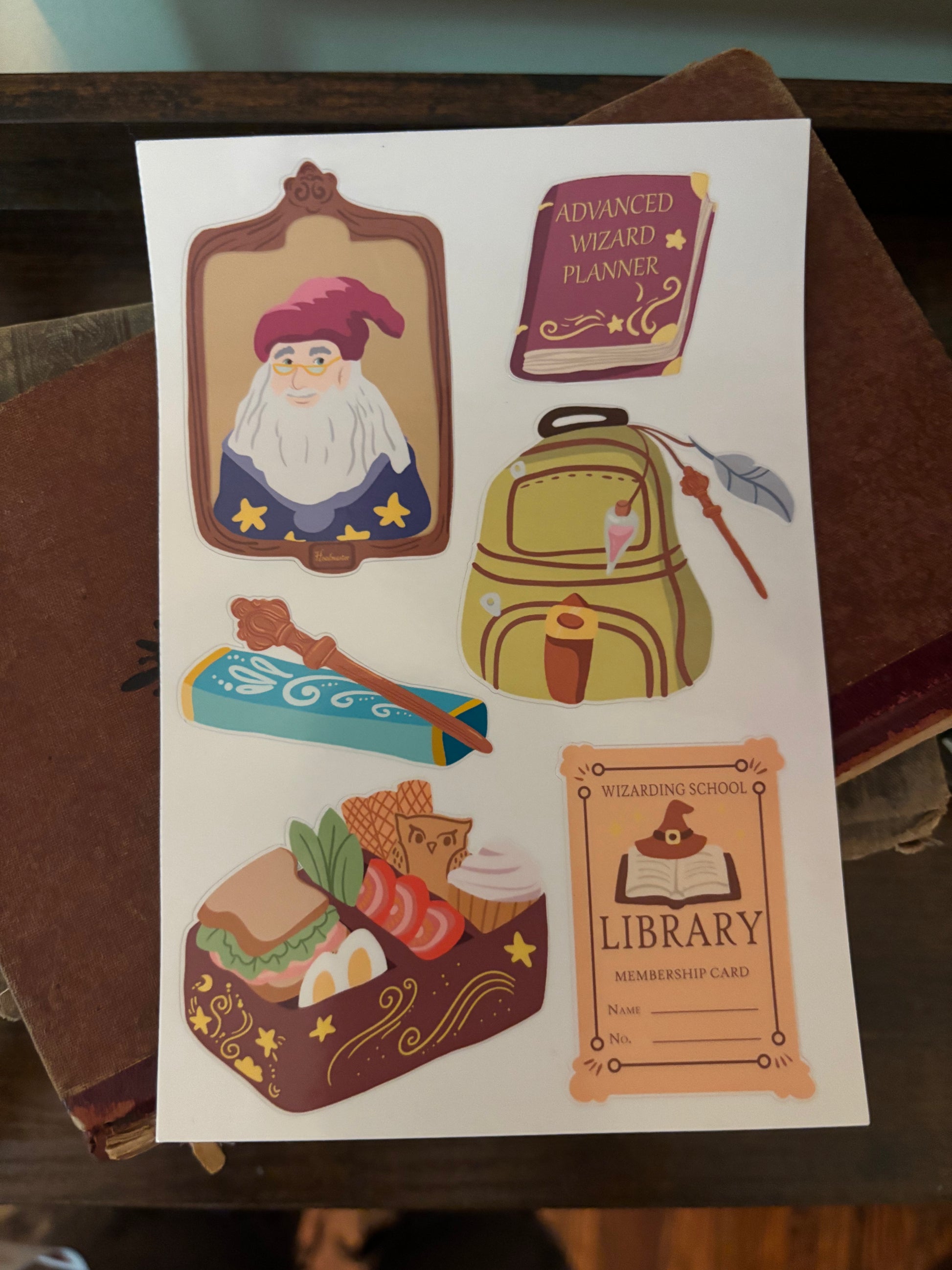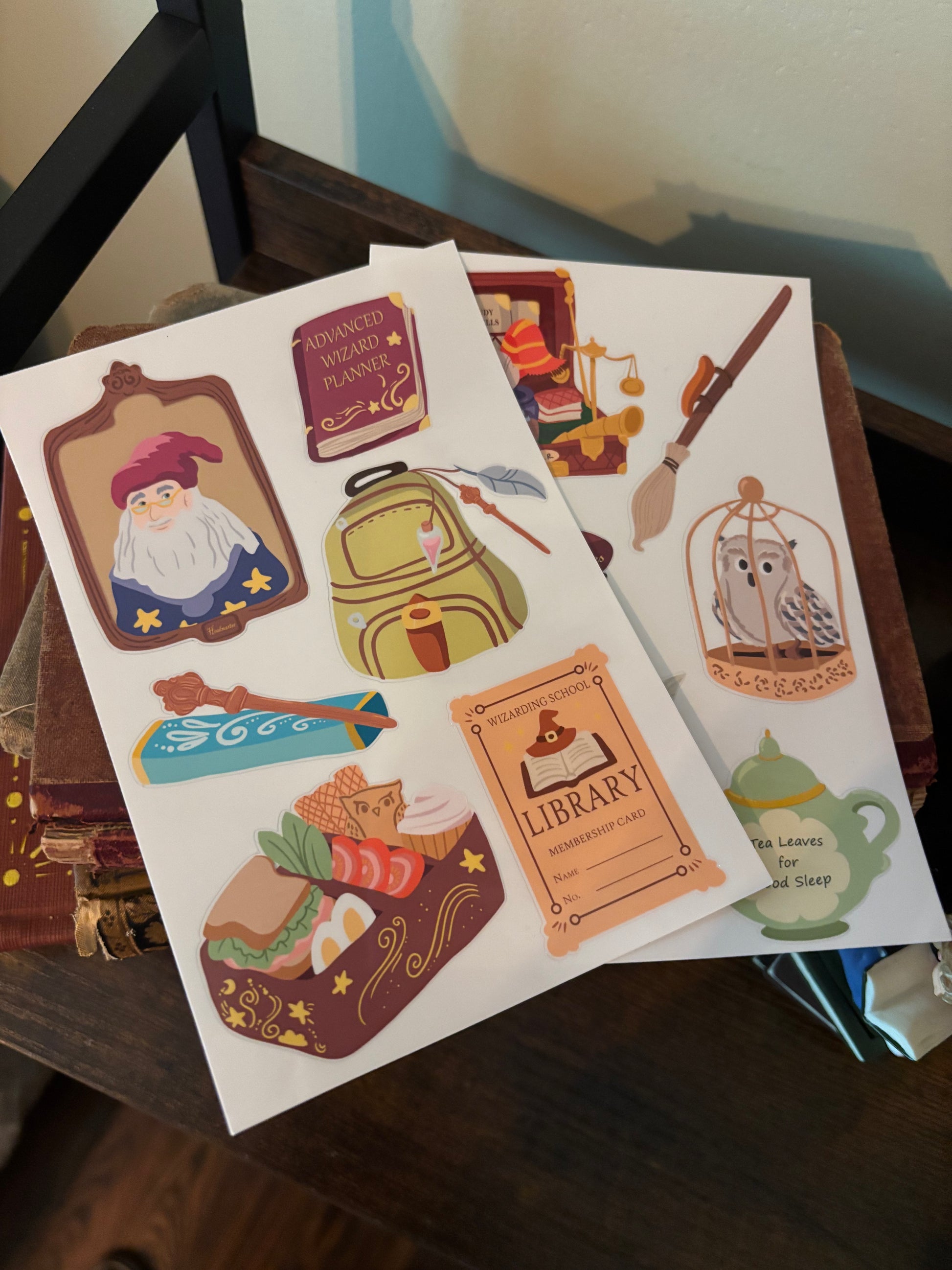 Two vinyl sticker sheets featuring wizarding school essentials! All stickers have a heavy duty gloss covering and are water and weather proof!